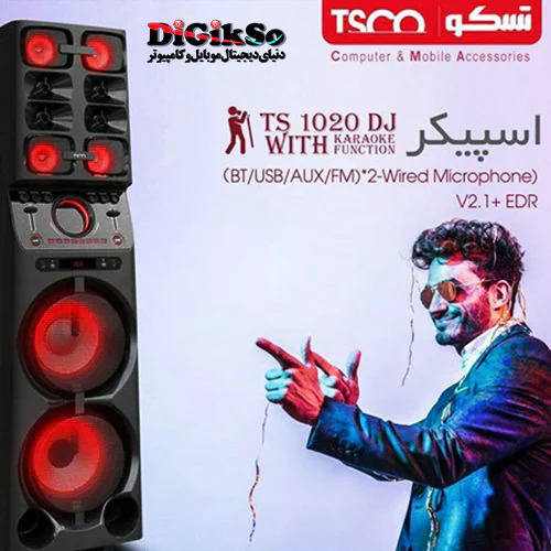 اسپیکر TS1020DJ، اسپیکری مدرن از برند تسکو (TSCO) است که با امکاناتی کاربردی و ظاهری جذاب تولید شده است. بدنهی این کالا به خوبی با دکوراسیونهای متنوع منازل و حتی فروشگاهها هماهنگ میشود. روی بدنهی این اسپیکر تعدادی دکمه برای روشن یا خاموش کردن دستگاه و کنترل و مدیریت پخش تعبیه شده است. راههای ارتباطی TS1020DJ شامل دو عدد پورت USB، جک AUX و بلوتوث میشوند. از طریق پورت USB میتوان فلش مموری یا هارد اکسترنال خود را به اسپیکر متصل کرده و فایلهای صوتی موجود در آن را پخش کنید. TS1020DJ از فرمتهای صوتی MP3 و WMA پشتیبانی میکند. همچنین بلوتوث که جذابترین راه ارتباطی این محصول محسوب میشود، امکان انتقال بیسیم فایلهای صوتی را به اسپیکر فراهم میکند. از این طریق به راحتی میتوان موبایل یا تبلت را به اسپیکر متصل کرد و فایلهای صوتی دلخواه را از اسپیکر شنید. یکی از قابلیتهای جذاب این اسپیکر، کارائوکه است. با اتصال یک میکروفون به این سیستم میتوانید خوانندگی را تجربه کنید. البته برای بهرهمندی از این قابلیت باید فایل صوتی مخصوص را داشته باشید. منبعتغذیهی این اسپیکر از طریق اتصال به برق تامین میشود.