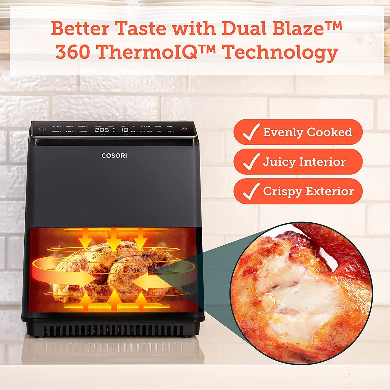 سرخ کن کوسوری مدل COSORI CAF-P583S با استفاده از فناوری گردش هوای سریع، پخت یکنواخت غذا را تضمین می‌ کند و در عین حال ظاهری شاداب و لطیف را حفظ می‌ کند. المنت حرارتی ۱۷۵۰ وات قدرت کافی برای پیش گرم کردن سریع و پخت کار آمد فراهم می کند و زمان کلی پخت را کاهش می دهد.