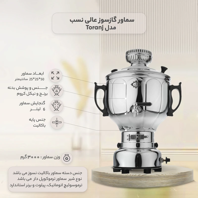 سماور گازسوز عالی نسب مدل ترنج Toranj ظرفیت ۶ لیتر